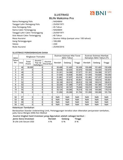 Manfaat asuransi akan tetap diberikan kepada nasabah walaupun nasabah memiliki pertanggungan asuransi sejenis pada lembaga asuransi lain (dapat double klaim). Nilai manfaat pertanggungan asuransi hingga Rp 1,5 Milyar (BNI Tapenas IDR) atau USD 150,000 (BNI Tapenas USD) per rekening Nasabah dengan nilai maksimal Rp 6 Milyar (BNI Tapenas IDR ...