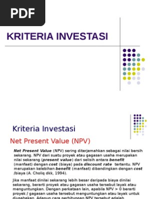 Pengertian dan Kriteria Investasi. Pengertian Investasi. Pengertian Investasi menurut Fitzgeral, Investasi adalah suatu aktivitas yang berhubungan dengan usaha penarikan sumber-sumber (dana) yang dipakai untuk mengadakan barang modal pada saat sekarang dan dengan barang modal akan dihasilkan aliran produk baru di masa yang akan datang.