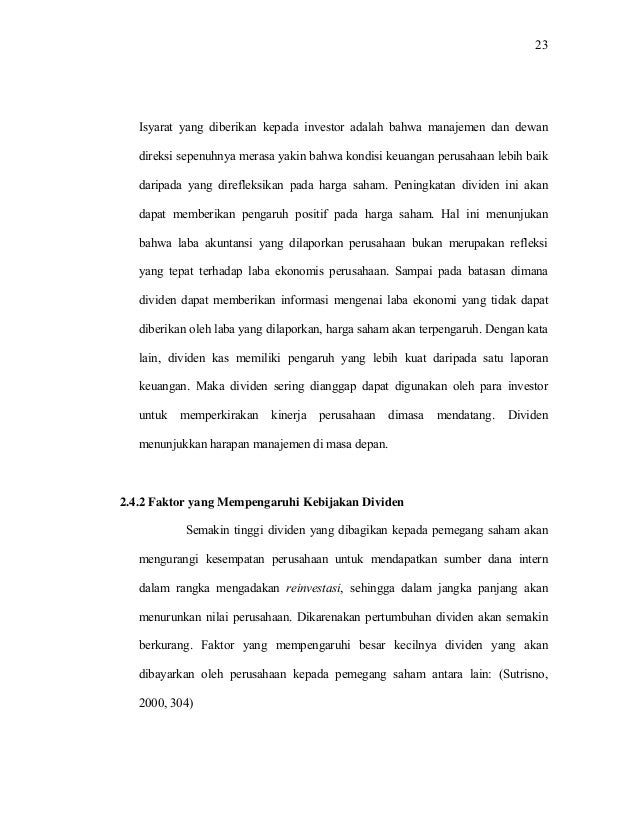 Teori, Jenis dan Faktor yang Mempengaruhi Kebijakan Dividen. Kebijakan dividen adalah pengambilan keputusan dalam menentukan jumlah laba yang diperoleh perusahaan untuk dibagikan/dibayarkan kepada pemegang saham sebagai dividen dan berapa banyak yang harus ditanam kembali (laba ditahan) sebagai pembiayaan investasi di masa datang.