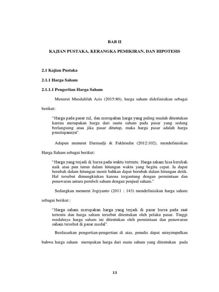 Berdasarkan pengertian para ahli diatas saham merupakan surat bukti tanda kepemilikan suatu perusahaan yang didalamnya tercantum nilai nominal, ... Mengestimasi nilai faktor-faktor fundamental yang mempengaruhi harga saham di masa yang akan datang ... 2.1.2.3 Harga Saham Menurut Brigham & Houston (2010:7) mengemukakan definisi harga