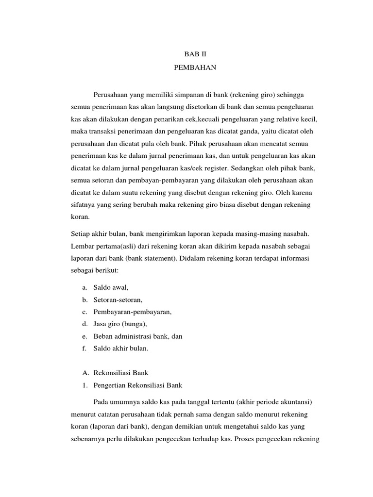 Setiap akhir bulan bank membuat laporan kepada perusahaan berupa. Cicilan utang perusahaan kepada Bank BCA dikenai bunga 9% setahun dan sebesar Rp 2.000.000,- akan dibayar bulan Januari; Perusahaan menerima jasa giro dari bank sebesar Rp 800.000,- dengan dikenai beban administrasi bank sebesar Rp 200.000,- Pada akhir setiap bulan, Bank biasanya memberikan laporan ini kepada perusahaan. Pada saat diterimanya laporan ini, perusahaan harus memeriksa apakah jumlah pada pernyataan bank sesuai dengan jumlah pada rekening kas perusahaan di buku besar, juga terbalik. Proses verifikasi ini disebut rekonsiliasi Bank. Laporan Bulanan untuk periode laporan bulan September 2013 sampai dengan periode Laporan bulan Agustus 2014 paling lambat akhir bulan berikutnya. (2) LJKNB berupa Perusahaan Asuransi dan Perusahaan Reasuransi tidak diwajibkan menyampaikan Laporan Bulanan untuk periode bulan September 2013, Desember 2013, Maret 2014 dan Juni 2014. Laporan keungan bersifat konservatif dalam menghadapi situasi ketidakpastian. Laporan Keuangan selalu berpegang teguh kepada sudut pandang ekonomi dalam memandang peristiwa-peristiwa yang terjadi, bukan kepada sifat formalnya. Pemeriksaan Laporan Keuangan dapat dilakukan yang pertama oleh internal perusahaan. Pemeriksaan selanjutnya dilakukan ...
