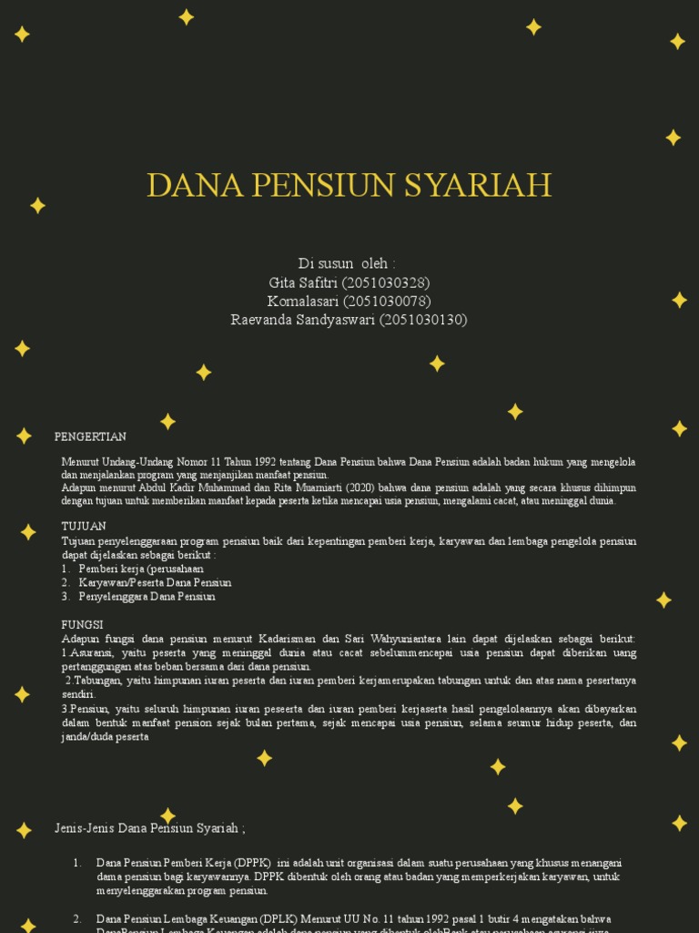 Dana pensiun diatur dalam Undang-Undang No. 11 tahun 1992 adalah badan hukum yang mengelola dan menjalankan program yang menjanjikan manfaat Dana pensiun syariah adalah dana pensiun yang dikelola dan dijalakan berdasarkan prinsip syariah. Meskipun di Indonesia pertumbuhan... Dana pensiun syariah adalah badan hukum yang mengelola dan menjalankan program yang menjanjikan manfaat pensiun sebagaimana dimaksud dalam peraturan perundang-undangan yang diselenggarakan berdasarkan prinsip syariah. Apalagi setelah keluarnya suatu Undang-undang yang mengaturnya yaitu UU Nomor 11 Tahun 1992 tentang Dana Pensiun. Hampir seluruh perusahaan dewasa ini telah menyelenggarakan dana pensiun bagi karyawannya, banyak alternatif pilihan untuk memperoleh pensiun dari lembaga lainnya. Erick Thohir menyebut saat ini struktur dana pensiun (dapen) di BUMN terlalu besar sehingga menjadi sarang korupsi bagi pihak-pihak tertentu. Menurut Erick, pihaknya selama ini tidak bisa membersihkan dapen BUMN karena ada Undang-Undang (UU) yang mengikat.