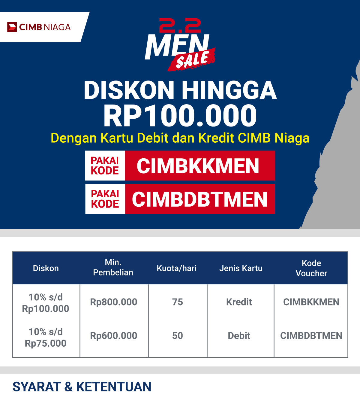 Promo berlaku maksimal diskon Rp. 40.000,- Promo berlaku dengan minimal belanja Rp. 200.000,- menggunakan Kartu Kredit CIMB tipe apa pun kecuali Kartu Corporate. Kode voucher berlaku setiap hari dan hanya dapat digunakan 1 hari 1 kali pemakaian untuk setiap customer. Periode promo berlangsung dari tanggal 15 Juli - 31 Desember 2021.