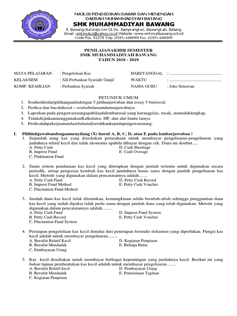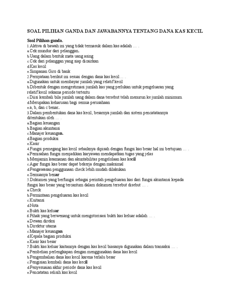 Jan 01, 2022 · Sep 1, 2019 — Dalam pembentukan dana kas kecil, besarnya jumlah dan sistem pencatatannya ditentukan oleh... a.bagian keuangan b.bagian akuntansi c.manajer ...2 answers · 140 votes: Jawaban:c.manajer keuanganmaaf kalo salah#back to school Dalam sistem tatabuku dobel yang mula-mula diajarkan oleh pendeta italia paciollo pada tahun 1494, neraca itu asal mulanya hanya dipergunakan untuk ... Sep 01, 2019 · Dalam pembentukan dana kas kecil, besarnya jumlah dan sistem pencatatannya ditentukan oleh... a.bagian keuangan b.bagian akuntansi c.manajer keuangan - 23965314 Mala3066 Mala3066 01.09.2019 Q. Dalam pembentukan dana kas kecil, besarnya jumlah dan sistem pencatatannya. ditentukan oleh … .