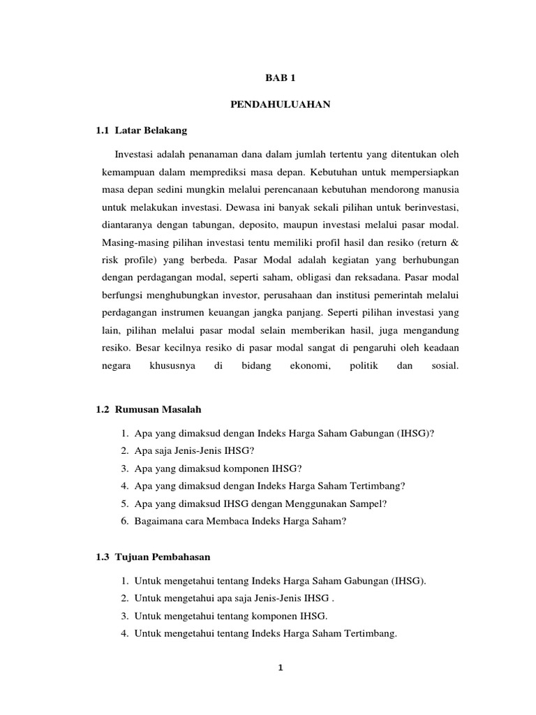 5 Dec 2019 — keuangan, bukan Indeks Harga Saham Gabungan (IHSG). Proksi dalam mengukur dan membuat model pengembalian investasi (return),.52 pages Indeks harga saham gabungan IHSG terus mengalami penguatan dalam dua bulan terakhir. Setelah itu IHSG bergerak turun hingga 25 Agustus 2015 mencapai 2056X. Data ihsg 10 tahun terakhir. Pada penutupan perdagangan pekan ini IHSG mengalami perubahan sebesar 136 persen atau turun 6742 poin ke level 4880359 dibandingkan pada pekan lalu. Ada 12 jenis indeks saham di Indonesia yang tercatat di Bursa Efek Indonesia. Berikut penjelasan lengkap masing-masing indeks saham yang ada di Indonesia saat ini: 1. Indeks yang digunakan untuk mengukur pergerakan seluruh saham yang tercatat di BEI. Indeks harga saham gabungan (IHSG) 2. Kepanjangan IHSG adalah singkatan dari Indeks Harga Saham Gabungan, yaitu grafik saham yang menunjukkan pergerakan rata-rata seluruh saham di dalam bursa efek. Dengan adanya grafik IHSG, masyarakat...