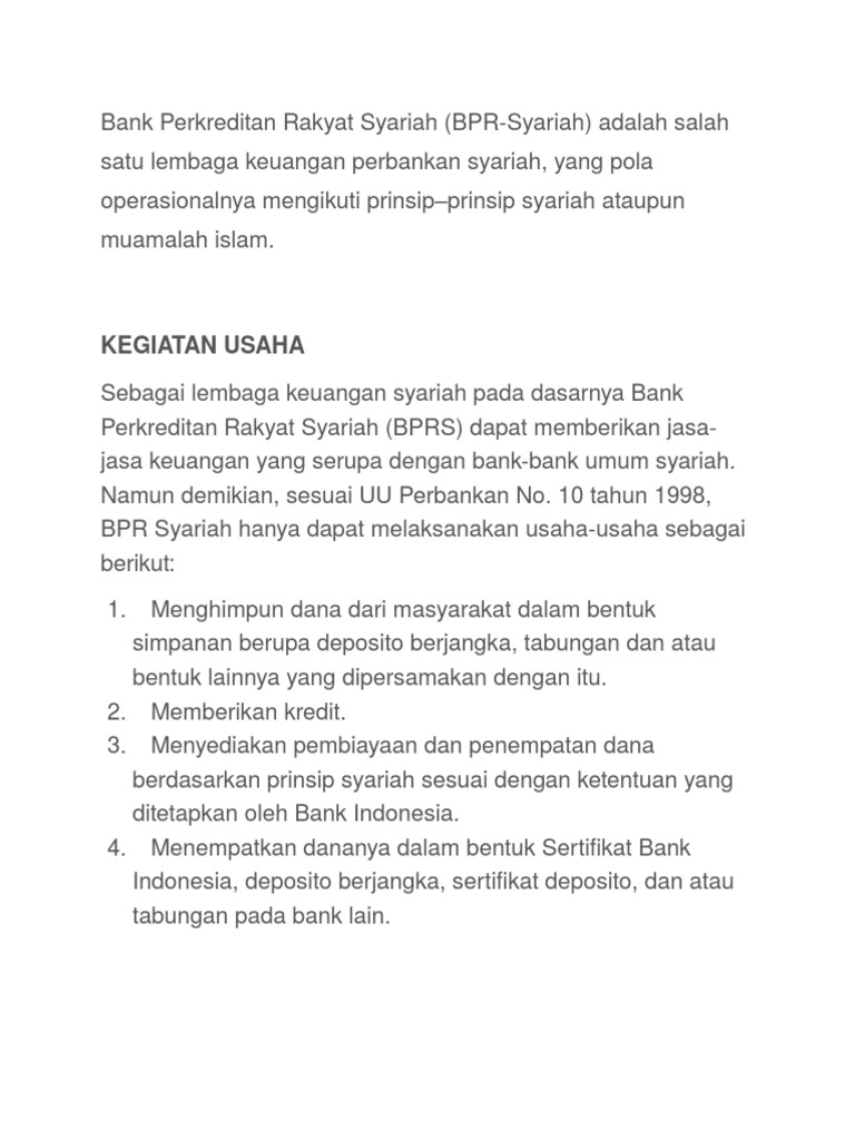 -Melakukan kegiatan usaha dalam valuta asing. -Melakukan penyertaan modal dengan prinsip prudent banking dan concern terhadap layanan kebutuhan masyarakat menengah ke bawah. -Melakukan usaha lain di luar kegiatan usaha sebagaimana yang dimaksud dalam usaha BPR. Pendirian bank perkreditan rakyat. 1. Pemenuhan persyaratan modal disetor minimum untuk Modal. Bank. Perkreditan. RAKYAT A. Persentase Minimal Kepemilikan Saham 1 VI. Pembukaan kantor dan kegiatan pelayanan kas bank perkreditan rakyat a... Kegiatan bank umum lebih luas dari bank perkreditan rakyat. Artinya produk yang ditawarkan oleh bank umum lebih beragam, hal ini disebabkan bank umum mempunyai kebebasan untuk menentukan produk dan jasanya. Sedangkan Bank Perkreditan Rakyat mempunyai keterbatasan tertentu... Bank Perkreditan Rakyat (BPR) , yaitu bank yang menjalankan aktivitas perbankan secara konvensional maupun prinsip syariah Islam dimana dalam kegiatannya tidak memberikan jasa di bidang pembayaran. Aktivitas BPR hanya mencakup penghimpunan dana dan penyaluran dana saja.