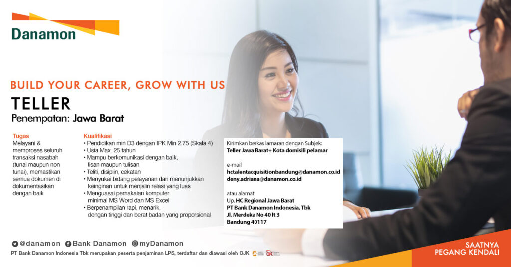 Temukan karir pekerjaan Lowongan kerja bank teller dan lowongan kerja yang serupa disini. Melaksanakan fungsi teller secara efektif & efisien sesuai target yang telah ditetapkan. Melaksanakan proses transaksional di area Teller, dalam rangka… Самые новые твиты от Info Lowongan kerja (@lowongankerjalu): "Lowongan Kerja BUMN Bank Mandiri (Persero) D3 Semua Jurusan Tahun 2021 Admin Collection Kualifikasi : Usia maksimal 24 tahun (fresh graduated) atau 26 tahun (experienced) Pendidikan minimal D3 semua info loker disini Berikut informasi lengkap lowongan kerja di Bank Syariah yaitu Bank Muamalat untuk Cabang di Jakarta. Silahkan ditonton ya...SUBSCRIBE (GRATISS GUYS)https...