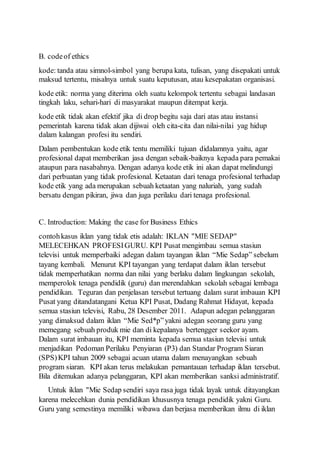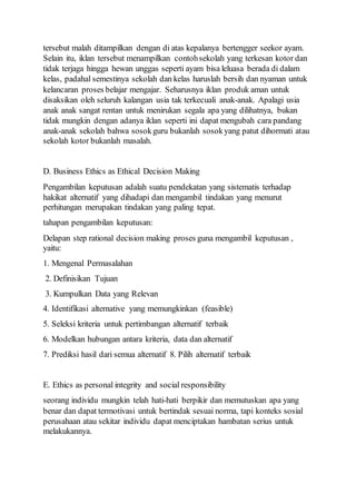 Etika bisnis sendiri terbagi dalam: · Normative ethics: Concerned with supplying and justifying a coherent moral system of thinking and judging. mengevaluasi etika perusahaan adalah iklan. Pesan yang disampaikan melalui iklan mempunyai pengaruh signifikan terhadap nama baik perusahaan.