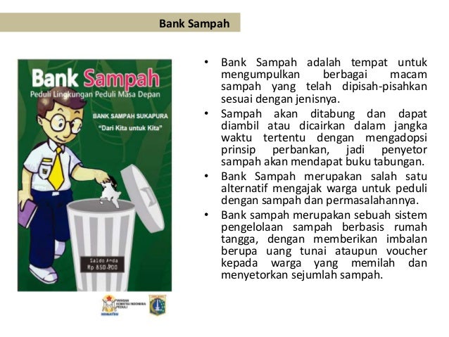 Pemberdayaan masyarakat melalui bank sampah. Growing companies eager to establish a good credit relationship with their bankers often don't pay attention to the costs of noncredit banking services, such as lock boxes, check reconciliation, and control disbursements. That can be a cos... Dalam kunjungannya, pengurus juga mengenalkan digitalisasi bank sampah melalui aplikasi E-Bank Sampah Kota Kediri. Menurut Wali Kota Kediri, aplikasi E-Bank Sampah Kota Kediri sangat membantu petugas bank sampah maupun nasabah dari bank sampah. Dalam aplikasi ini memudahkan pemantauan data sampah secara aktual dan real time. Percik Mei 2009 29 WAWA S A N Pemberdayaan Masyarakat dalam Pengelolaan Sampah D i banyak kota di negara berkem- hanya menyangkut isu teknis. Tetapi pengurangan timbulan sampah. Meng- bang, sistem pengelolaan sam- terkait erat dengan dimensi budaya dan urangi timbulan sampah sebaiknya harus pah oleh pemerintah maupun sosio-politis setempat. Bersinergi dengan UPT Bank Sampah Kota Makassar, Dinas Lingkungan Hidup Kota Makassar, pemberdayaan masyarakat melalui program Bank Sampah tersebut merupakan bagian dari program Tanggung Jawab Sosial dan Lingkungan (TJSL) Pertamina di sekitar area operasi Integrated Terminal Makassar. Baca Juga: