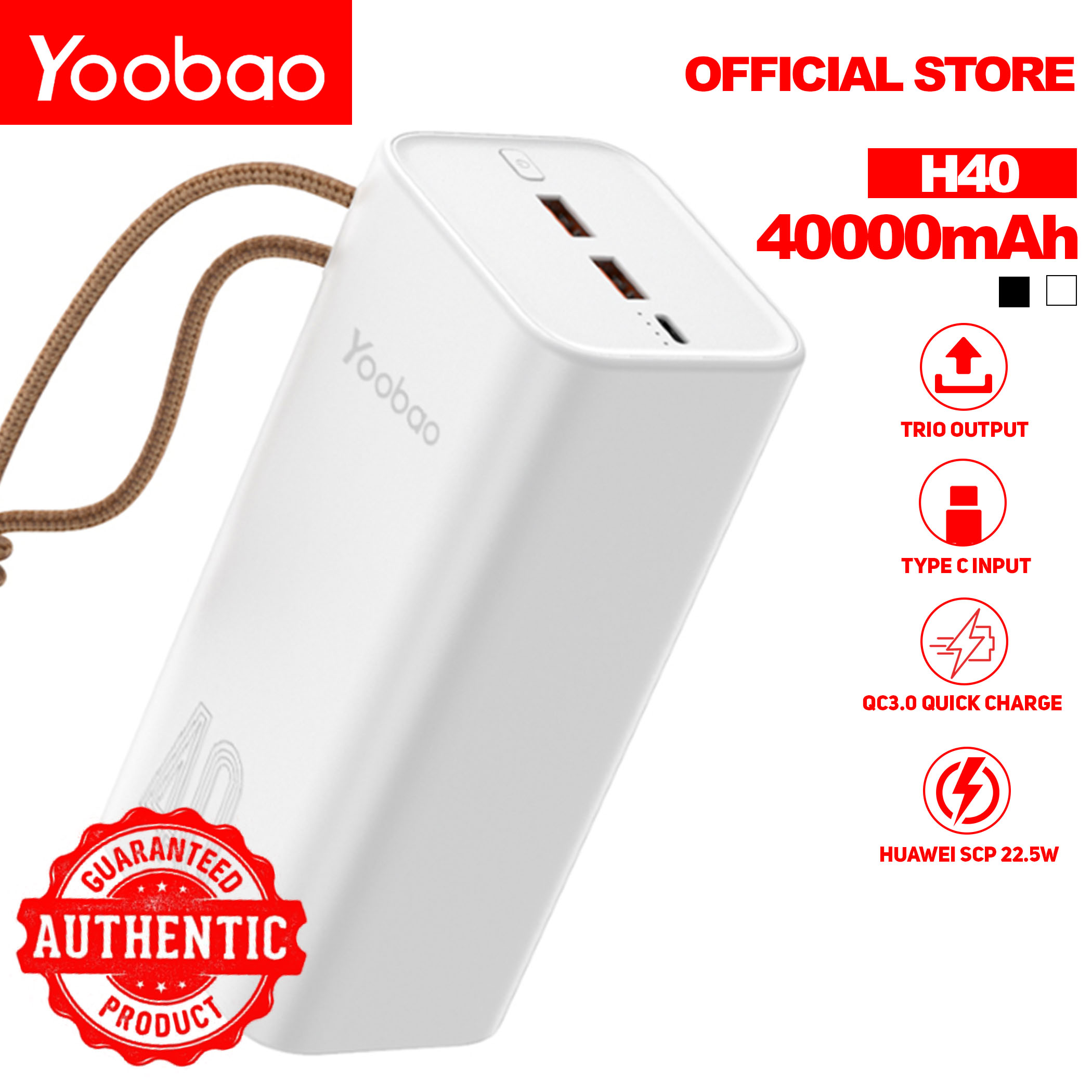 Yoobao H40 40000mAh 148Wh One Input Three Output SCP 22.5W PD20W PD45W Type-C Input & Output Multi-function High Capacity Power Bank