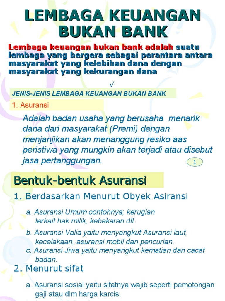 Pengertian Lembaga Keuangan Bukan Bank, Fungsi, & Contohnya Lembaga keuangan bukan bank adalah istilah resmi untuk menyebut institusi-institusi selain bank yang juga beroperasi di dunia perbankan. Peran lembaga keuangan bukan bank sangat penting demi menjaga stabilitas pengelolaan finansial suatu negara. Simak pembahasan selengkapnya di bawah ini. Pengertian Lembaga Keuangan Bukan Bank, Fungsi, & Contohnya Pengertian Lembaga Keuangan Bukan Bank (LKBB) Lembaga keuangan bukan bank atau LKBB adalah sebuah badan yang bergerak di bidang keuangan dengan tugas menghimpun dan menyalurkan dana kembali kepada masyarakat. Uang yang dihimpun tidak dalam bentuk deposito, tabungan, atau giro. Tetapi LKBB menerbitkan surat-surat berharga. Bank Lembaga Keuangan Bukan Bank Dan Ojk Otoritas Jasa ... BANK, LEMBAGA KEUANGAN BUKAN BANK DAN OJK (OTORITAS … 9 hours ago BANK, LEMBAGA KEUANGAN BUKAN BANK DAN OJK (OTORITAS JASA KEUANGAN) Bank Jenis-Jenis Bank a. Bank Sentral Fungsi bank sentral adalah sebagai bank dari pemerintah dan bank dari bank umum (banker's bank), sekaligus untuk mencapai dan memelihara kestabilan nilai rupiah. Adapun tugas bank sentral antara lain sebagai berikut.