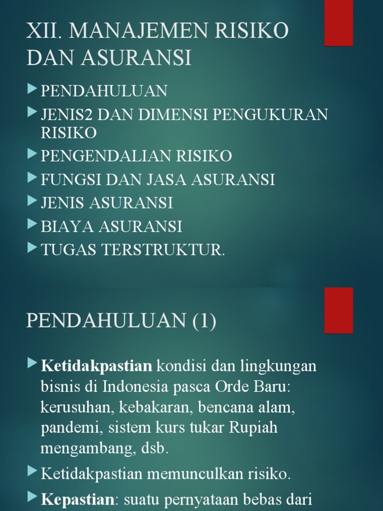 Simak Hubungan Manajemen Risiko dan Asuransi yang Perlu ... Adapun dari segi fungsi dan tugas, maka dapat dikatakan bahwa tugas dari suatu manajemen risiko itu adalah memberikan evaluasi dan penilaian terhadap cara-cara untuk menanggulangi risiko, sementara itu asuransi berfungsi untuk menangani semua proses pengalihan risiko dari pihak tertanggung kepada pihak penanggung. Risiko & Asuransi Menerangkan teknik dasar 'manajemen risiko' Menjelaskan bagaimana 'metode pengendalian risiko' dan cara terbaik yang dapat dilakukan 1A RISIKO Prof. Dr. Gordon Dickson, dalam "Introduction to Insurance" menyebutkan "Risks is the chance of loss" yang artinya "Risiko adalah kemungkinan terjadinya kerugian". 39 Soal Manajemen Resiko dan Asuransi Beserta Jawaban ... Soal Pilihan Ganda Materi Manajemen Resiko dan Asuransi 1. Risiko subyektif didefinisikan sebagai.... a. Ketidakpastian yang didasarkan pada kondisi mental seseorang b. Suatu situasi dimana baik keuntungan maupun kerugian mungkin terjadi c. Suatu situasi dimana hanya ada kemungkinan terjadi kerugian atau tidak terjadi kerugian d.