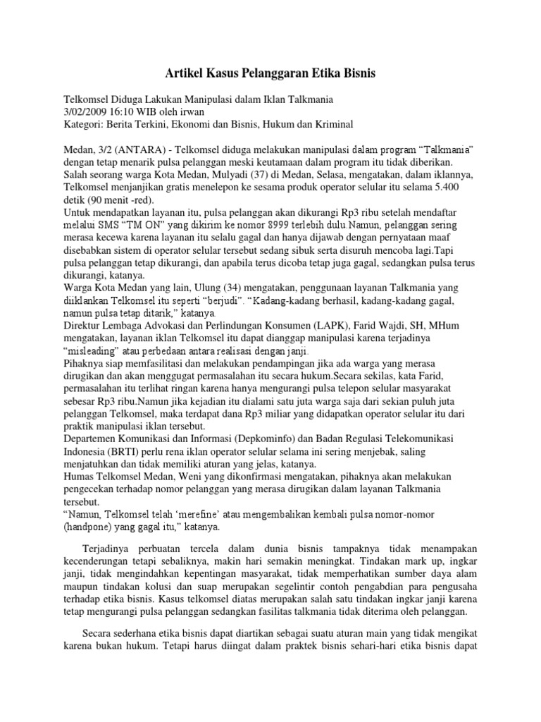Contoh Pelanggaran Etika Profesi Di Bidang Pariwisata Selain etika bisnis, terdapat etika profesi hotel yang seharusnya juga ditaati oleh ke-3 karyawan hotel Dafam dalam kasus diatas. Menurut Syailendra Reza (2011), Etika profesi perhotelan adalah tatanan tingkah laku bagi petugas yang menangani wisatawan agar dapat berhubungan dengan tamu secara sopan, baik, dan efektif. Kasus Pelanggaran Etika Bisnis oleh PT Megasari Makmur ... Undang-undang. Jika dilihat menurut UUD, PT Megarsari Makmur sudah melanggar beberapa pasal, yaitu : Pasal 4, hak konsumen adalah : Ayat 1 : "hak atas kenyamanan, keamanan, dan keselamatan dalam mengkonsumsi barang dan/atau jasa". Ayat 3 : "hak atas informasi yang benar, jelas, dan jujur mengenai kondisi dan jaminan barang dan/atau jasa". Kasus Etika Bisnis "Oreo PT. Nabisco" | idalkalhalmi30 Pelanggaran etika bisnis terhadap prinsip empati Seorang nasabah, sebut saja X, dari perusahaan pembiayaan terlambat membayar angsuran sesuai tanggal jatuh tempo karena anaknya sakit parah. X sudah memberitahukan kepada pihak perusahaan tentang keterlambatannya membayar angsuran, namun tidak mendapatkan respon dari perusahaan.