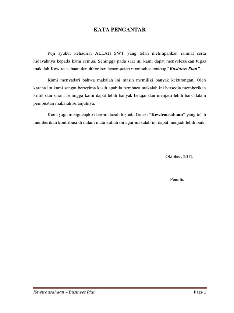 Contoh Bisnis Plan, Penjelasan dan Cara Membuat Bisnis Plan Bisnis plan seringkali diremehkan keberadaannya oleh pebisnis terutama pemula. Tanpa mereka sadari, sebenarnya bisnis plan inilah dokumen penting yang bisa memperlancar jalannya usaha. Berikut adalah penjelasan lengkap mengenai bisnis plan, alasan harus membuatnya, hingga contoh bisnis plan yang sederhana. Contoh Business Plan Sederhana dan Cara Membuatnya Lengkap ... Cara Membuat Business Plan Secara Teratur 1. Mengenali Bisnis yang Akan Dijalankan 2. Menentukan Arah dari Bisnis yang Dijalankan 3. Menentukan Target Bisnis yang Ingin Dicapai 4. Menuliskan Rancangan Rencana Bisnis Contoh Sederhana Business Plan A. Latar Belakang B. Visi dan Misi Usaha C. Gambaran Produk Usaha D. Rencana Usaha Contoh Proposal Bisnis / Bisnis Plan [Update ... - Karinov.co.id Apr 01, 2022 · Contoh Isi dari Proposal Bisnis. Secara umum, kira-kira berikut contoh daftar isi yang terdapat dalam bisnis plan. Walaupun dalam pembuatan proposal bisnis sebenarnya bisa saja berbeda disesuaikan dengan informasi yang butuh untuk disajikan di dalam proposal. Untuk mendapatkan format business plan secara lengkap dapat kamu lihat di laman ... Contoh Proposal Usaha Bisnis Plan Lengkap 2022 Contoh Proposal Usaha Bisnis Plan Lengkap 2022 Contoh proposal usaha tentunya dapat memberikan gambaran perencanaan sebelum memulai sebuah bisnis, sekaligus dapat meyakinkan calon investor. Melalui contoh proposal usaha, pelaku bisnis dapat mempersiapkan modal hingga melihat peluang pasar yang dapat diterapkan pada bisnisnya.