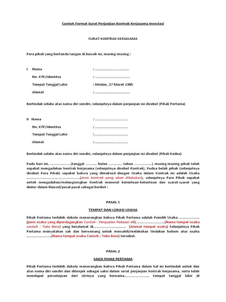 7+ Contoh Surat Perjanjian Kerjasama Investasi Serta Pasal ... 7+ Contoh Surat Perjanjian Kerjasama Investasi Serta Pasal-Pasalnya Maret 4, 2022 Contoh Surat Perjanjian Sewa Tempat Usaha - Dalam penggunaan surat perjanjian sewa tempat usaha berikut ini sangat dibutuhkan terutama bagi pebisnis atau penyewa tempat usaha seperti ruko atau lainnya.