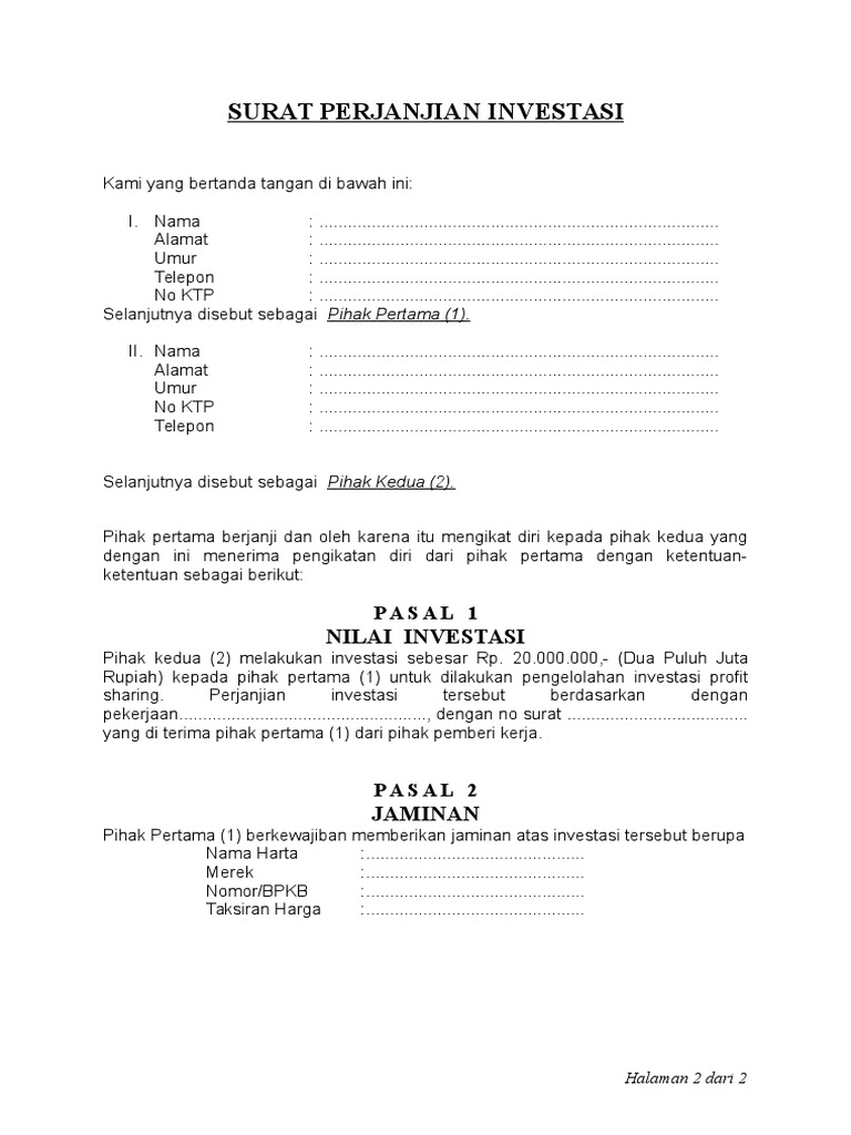 Contoh surat perjanjian investasi