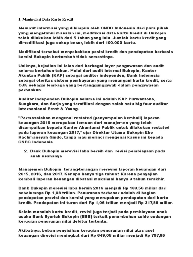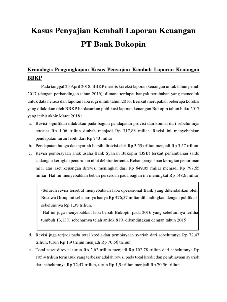 Kasus Bank Bukopin (A & B) - Pemeriksaan Akuntansi II ... PT Bank Bukopin Tbk. Merevisi laporan keuangan miliknya untuk tiga tahun terakhir, yaitu tahun 2015, 2016, dan 2017. Direktur utama Bukopin, Eko Rachmansyah Gindo dalam wawancara bersama CNBC menjelaskan bahwa permasalahan mengenai restated atau penyampaian kembali laporan keuangan tahun 2016 merupakan temuan dari manajemen yang telah ...