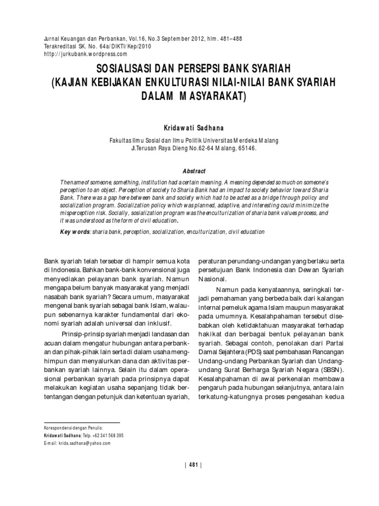 Implementasi Masyarakat Terhadap Syariah Kepada Bank ... Implementasi Masyarakat Terhadap Syariah Kepada Bank Syariah. Pandangan masyarakat terhadap bank syariah tentu berbeda. pandangan ini bisa berpengaruh pada tanggapan masyarakat ketika menentukan bank tertentu mengingat jumlah uang yang mereka miliki untuk disimpan atau dipinjamkan pada bank syariah. Perilaku ini dapat berupa penilaian dan ... Persepsi Masyarakat Terhadap Bank Syariah ~ Suksesmulia Home'S Fakta lain yang ikut membentuk persepsi masyarakat terhadap Lembaga Keuangan Syariah, yaitu komunikasi atau promosi yang dilakukan lembaga keuangan syariah kurang maksimal. Padahal promosi sangat efektif untuk sosialisasi, membentuk image dan merubah perilaku masyarakat menuju system keuangan syariah. (Pdf) Persepsi Masyarakat Terhadap Perbankan Syariah Di ... Penelitian bertujuan untuk menggambarkan persepsi masyarakat terhadap keberadaan bank syariah dan menentukan pilihan dalam berinvestasi dengan produk-produk perbankan syariah, serta prospek...