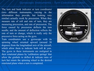 Turn and Slip Indicator vs. Turn Coordinator Compared ... The turn and slip indicator's gyroscope is mounted in such a way so as to negate any effect of gyroscopic precession. However, the turn and bank indicator uses gyroscopic precession to present rate of bank information. The Turn and Slip Indicator The more basic of the two instruments, the Turn and Slip Indicator, is actually two instruments in one.
