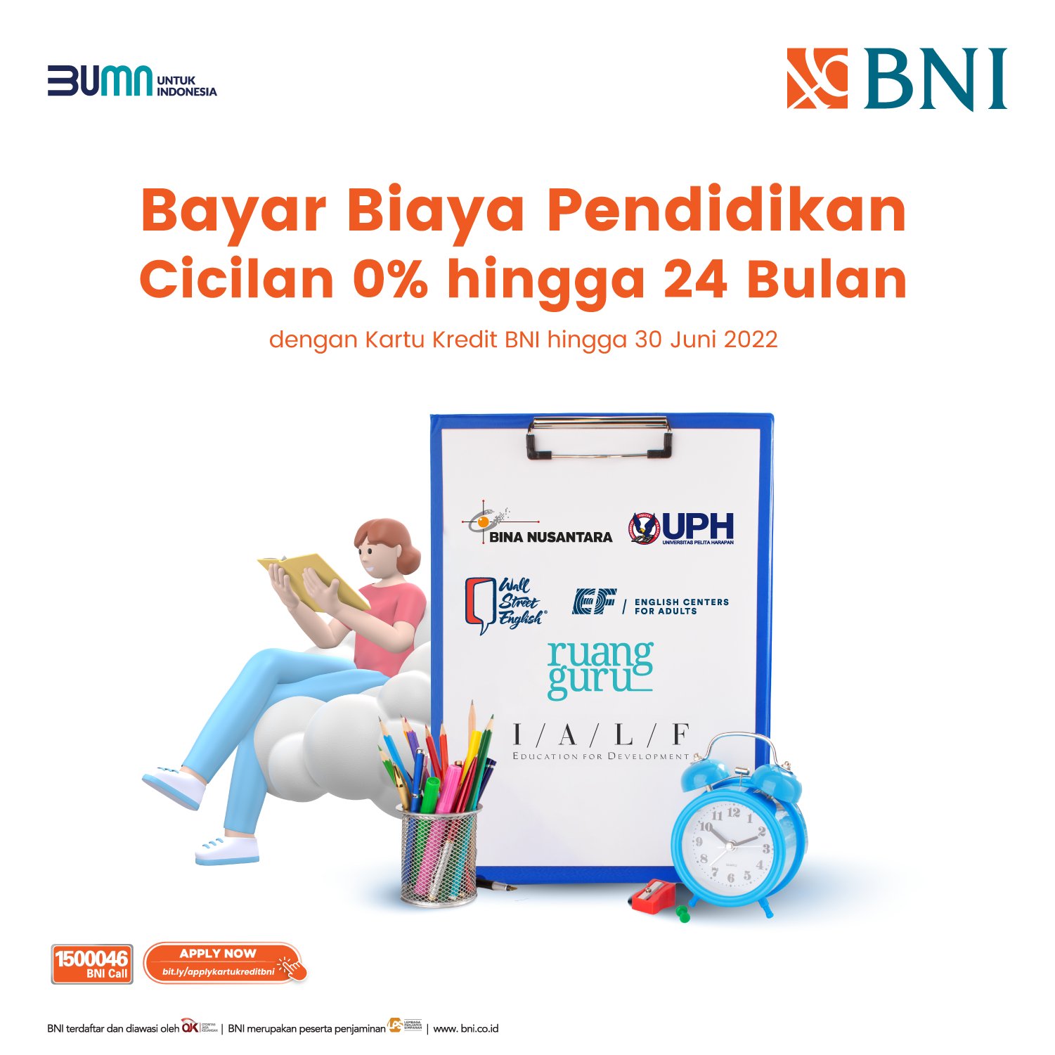 Cicilan Dengan Kartu Kredit | BINUS Online Learning Program Cicilan berlaku untuk kartu kredit BNI (baik Visa maupun Master) kecuali kartu kredit Korporasi BNI. Cicilan yang berlaku adalah sebagai berikut: Cicilan dengan bunga 0% untuk jangka waktu 3 dan 6 bulan (minimal transaksi Rp.500.000,-), atau 9 bulan (minimal transaksi Rp.5.000.000,-).